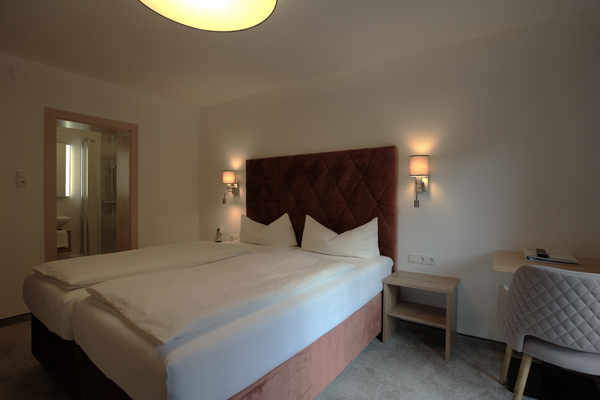 | Doppelzimmer mit Kingsizebetten eingerichtet mit Dusche/WC, SAT-TV, Radio, WLAN gratis, Telefon, Safe, teilweise Balkon, Zusatzbett möglich.